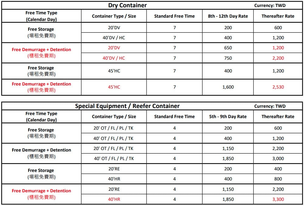 - Free time is calculated from the date of vessel arrival, or from the date of the laden container gate-in of inland transshipment cargo via Trucking service.