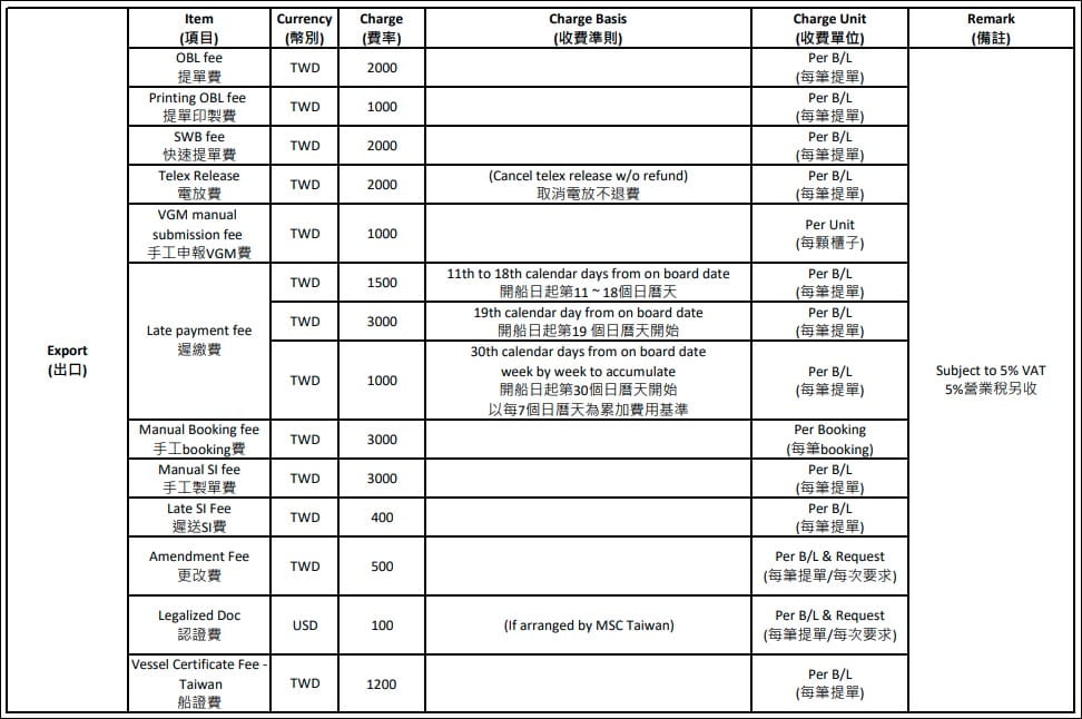 MSC Taiwan Local Charges – Export (Subject to 5% vat)